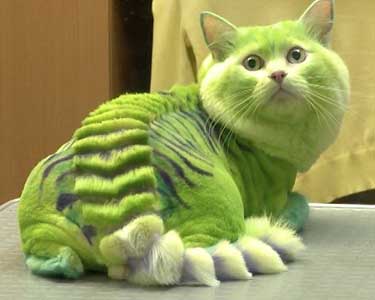 ரஷ்யாவின் மாஸ்கோவில் உள்ள யெகேடின்பர்க் நகரத்தில் செல்லப்பிரணிகளுக்கான சலூன் உள்ளது. அதன் உரிமையாளர் டாரியா கோட்ஸ் தனது சலூனில் அலங்கரிக்கப்பட்ட ஒரு பூனையை காண்பித்தார். பச்சை வண்னத்தில் அழகாக முடிவெட்டுடன் அது டிரகன் போலவே காட்சி அளிக்கிறது. அதேபோன்று வண்டு போன்ற நிறம் கொண்ட நாய்குட்டியையும் காண்பித்தார்.